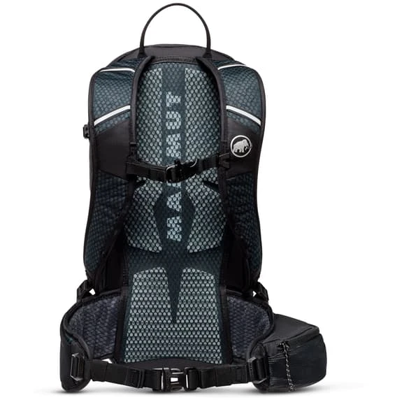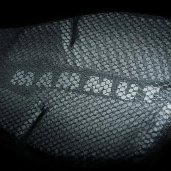 The Mammut Lithium 15L Backpack is mainly made of recycled materials with a durable water-repellent treatment that does not contain PFC. The very light and breathable shoulder padding make it feel very comfortable to wear. The air vents in the 3D EVA foam provide good ventilation. The padded hip belt has a fold-out pocket for your smartphone. If you don’t need it, you can simply remove it. The same applies to the integrated rain cover. The backpack is compatible with hydration systems.