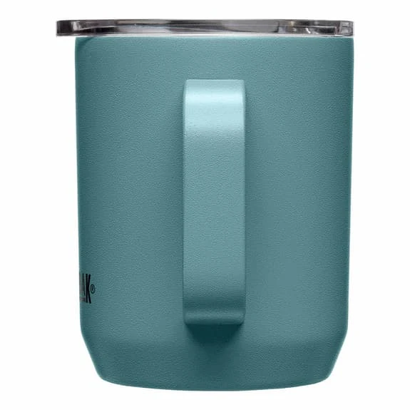 The Camelbak Camp Mug Insulated, with a 355 ml capacity, is tough and durable. It is made of double-walled, vacuum-insulated stainless steel with a powder-coated finish, which keeps it aesthetically pleasing on the outside while keeping the inside warm. The lid has three modes, slides open to control flow and is spill resistant. A non-slip silicone pad, located on the base, provides a soft seat on surfaces to prevent scratches and spills.