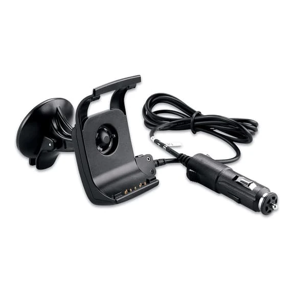 The Garmin automotive mount with speaker for Montana and Monterra includes an integrated speaker mount and a suction cup for easy installation. It also includes a vehicle power cable.
