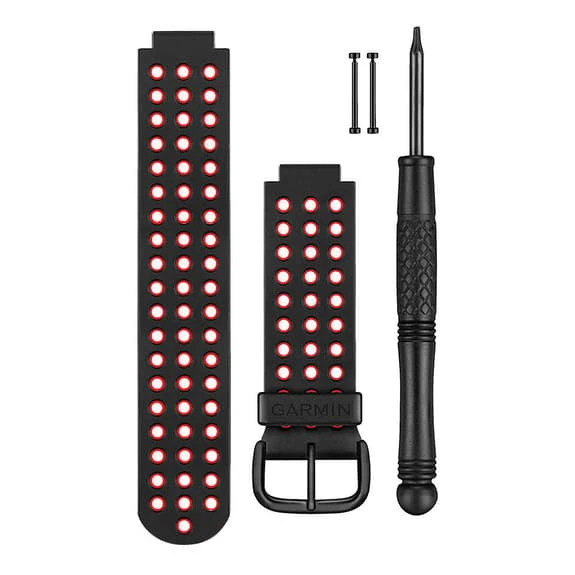 Replacement strap for Garmin Forerunner 220 and 620 watches in black-red colour. With this strap you can change the appearance of your Forerunner very easily and quickly: simply remove the old strap and attach the new one with the pins for a better and more comfortable fit. This kit comes with the watch strap, pins and pin removal tools. You can complete your Forerunner collection with straps of different colours.