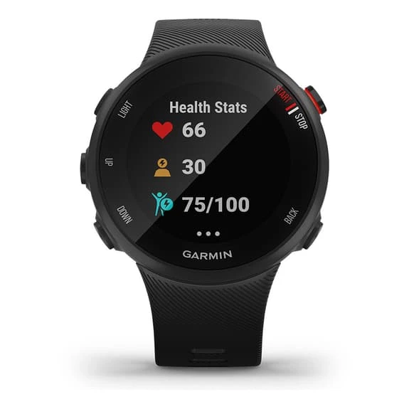 The Garmin Forerunner 45S is an easy-to-use racing watch that monitors the heart rate on your wrist and uses GPS to track your pace, distance, intervals and more. It features connection features like smart notifications for text messages and calls you receive, automatic uploads to our Garmin Connect community, live tracking, and controls for your phone’s music. Tracking and security functions include incident detection (during specific activities) and assistance. Both functions send your location in real time to your emergency contacts.