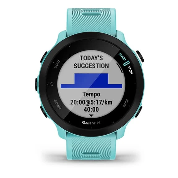 The Garmin Forerunner 55 is made with lightweight materials and designed for both running and training sessions. It has a daily physical activity tracking control and a heart rate sensor that measures the intensity of the heart’s effort during activities, and it also has a recovery control that indicates how long you should rest before making another big effort. For all running enthusiasts it also has an integrated running forecast which takes into account the level of fitness and training history to help the user to achieve the goals.