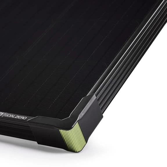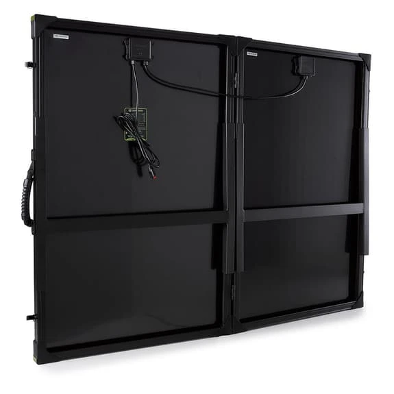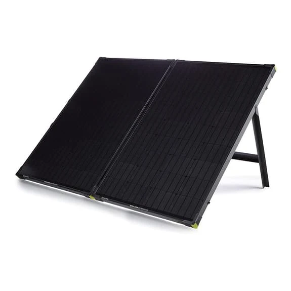 The Goal Zero Boulder 200 folding solar panel consists of two Boulder 100 solar panels (200 watts in total) chained together and connected by a hinge. It includes integrated holders, as well as a handle and a protective fabric bag for easy transport.