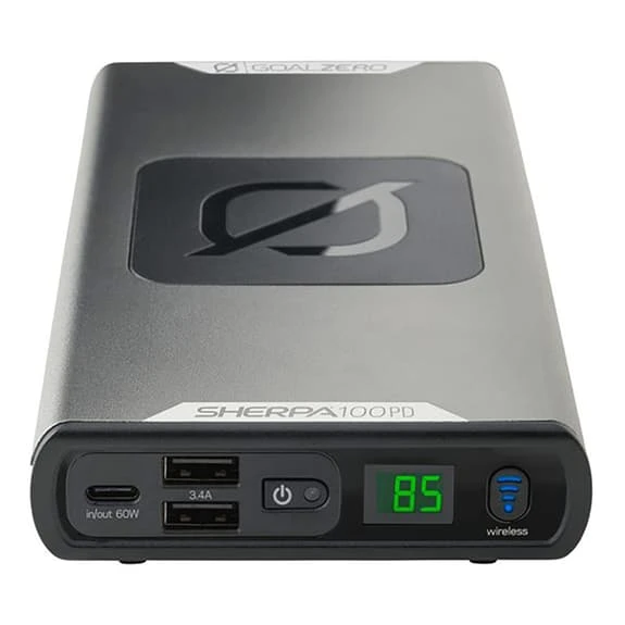 The Goal Zero Sherpa 100PD With 94.72 Watts of power delivered to your most crucial devices in a fraction of the time, the Sherpa 100PD is made for action-packed days when every minute counts. Charge USB-C laptops, tablets, phones, mirrorless cameras, and more.