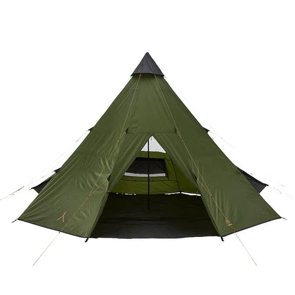 The Grand Canyon Black Falls 8 tent is a traditional teepee tent but made with modern day materials, making it lightweight and easy to carry. It’s also incredibly easy to assemble: just lay it out, insert the pole and secure it to the ground. Pitched! It can sleep up to 8 people or can be used as a shelter for group meetings. The double floor protects from mud and dirt, but can be left at home if not needed. Large awnings and mosquito nets on the roof windows provide optimal ventilation and an ideal interior temperature.