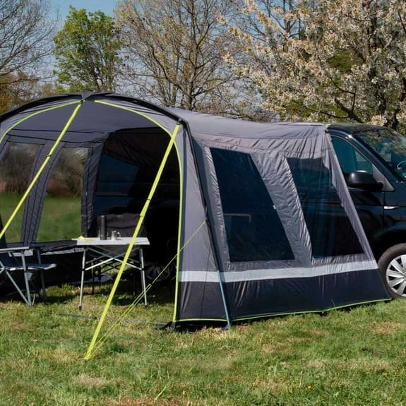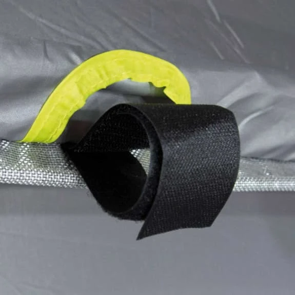 The High Peak Trento 2.0 Canopy offers a flexible space and can be pitched quickly. Lightweight and small, it occupies little space in your vehicle. The steel construction with straight walls and an arched roof optimises the use of space and allows for quick pitching. A large panoramic window provides light, curtains will offer privacy from prying eyes, and the rot-proof fabric prevents dirt and moisture from damaging the tent. Three adjustable, neon yellow storm straps and high-viz tensioners are easily visible at sunset.