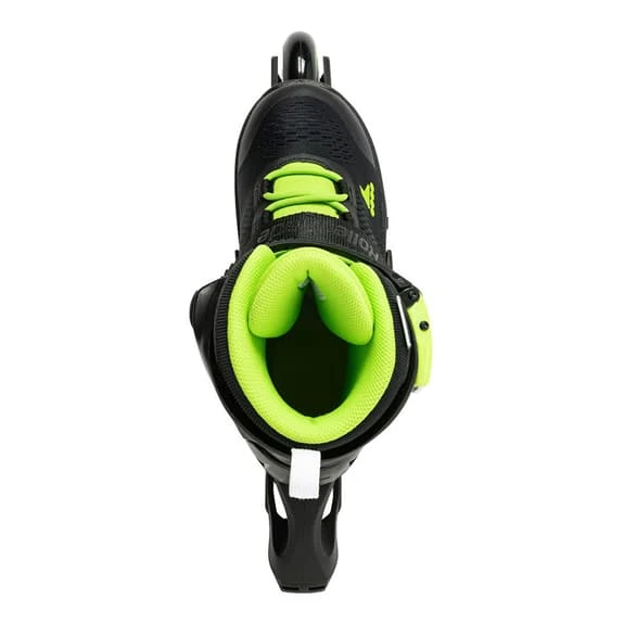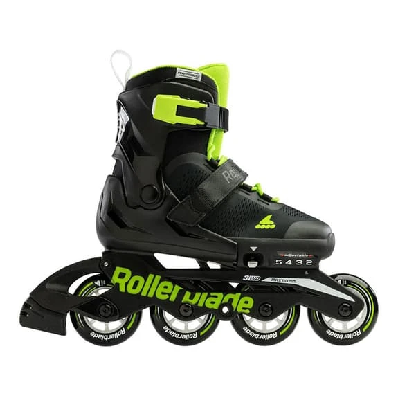 Microblade Rollerblades for children are adjustable skates. They come in four full sizes. An easy-to-use extension system works at the touch of a button, and the markers in the toe area align the skates to the correct size. These skates provide better support and help improve stability, balance and control. Both the Junior Fit linings and the mesh are designed to make the Microblade comfortable, and the closure system provides a secure fit while being easy to put on and take off.